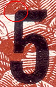 Auf Bogengestempelten Bogen mit der Nummer 3 mit schwarzer Zählnummer und Buchstaben F kommt der Punkt nicht vor.Die Formnummer bei diesem Bogen ist deutlich und die Reihenzählernummer 1 ist deutlich kräftiger gedruckt.
