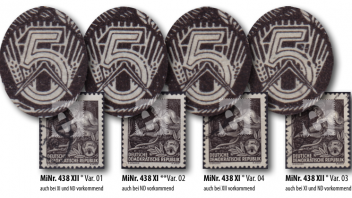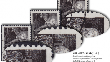Der Fehler bei der MiNr. 412 kommt in dieser Form sowohl bei der II. als auch bei der III. Ausgabe vor und variiert analog des hier gezeigten 405 in seiner Ausprägung.