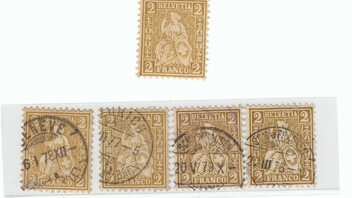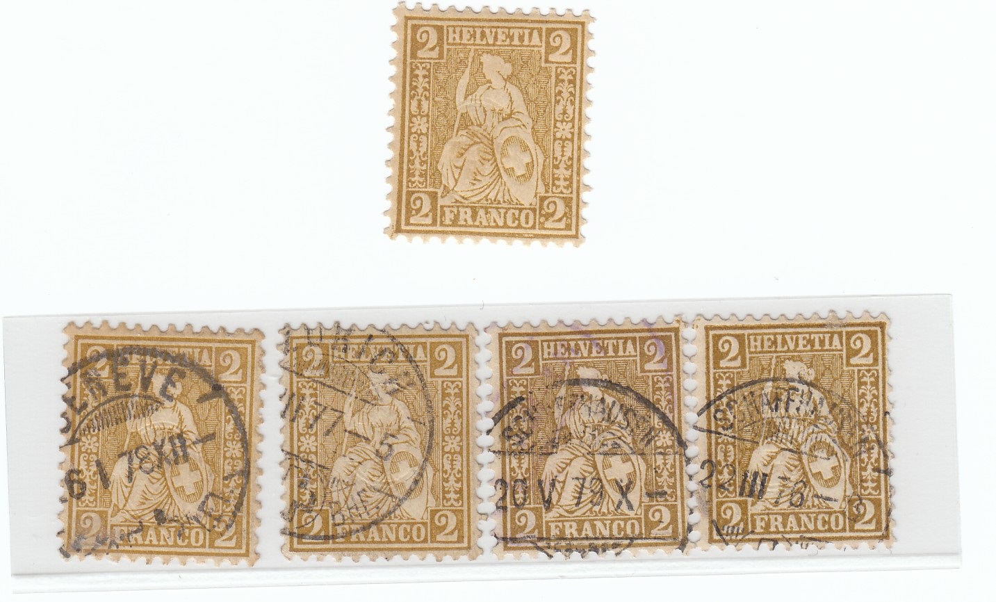 Auf dem 1. Scann, das sind alles Michel-Nr. 29. die genaue Farbe kann ich anhand eines scann's nicht genau beurteilen, aber da gibt es keine grosse Preisliche Unterschiede. Aber die Farben f, g, und h kann man hier ausschliessen, die gab es erst ab 1880. Deine Marken sind aber früher abgestempelt worden. Ich nehme an, die sind alle in der Farbe (gelblich)braunoliv. Also Michel-Nr. 29d.