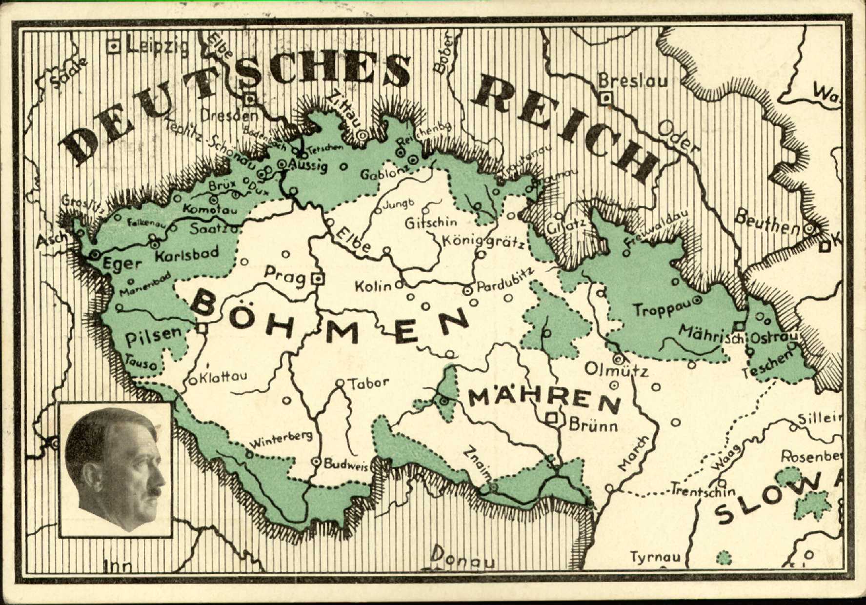 Wahrscheinlich konnte man die Karte mit der tschechischen Marke und deren Sonderstempel erwerben und später im "Reichsgebiet" zusätzlich frankieren und abstempeln lassen (hier in Leipzig).