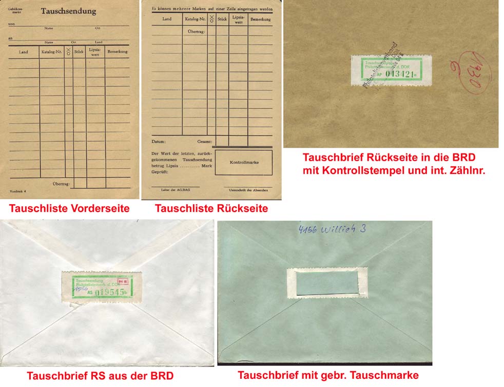 Sie schreiben "denn der DDR-Zoll hat die Tauschmarke immer von der Tauschsendung entfernt." Das ist nicht richtig. Sie wurde bei der Rücksendung in der Regel auf der Rückseite des Briefes angebracht und vom Empfänger für die neue Tauschsendung in die Bundesrepublik, oder Ausland, gebraucht. Deshalb wurde die Tauschmarke aus dem Brief ausgeschnitten, auf der Liste der neuen Tauschsendung aufgeklebt und der neuen Tauschsendung im offenen Brief beigelegt. Der Tauschwart des Vereins hatte die Pflicht der Überprüfung um anschließend die gesammelten offenen Tauschbriefe des Vereins an die Bezirkskontrollstelle zu senden. Dort wurden sie abermals geprüft, die Tauschliste entnommen und wenn unbeanstandet verschlossen, mit einer neuen Tauschmarke auf der Rückseite versehen und der Post zum Versand übergeben. -