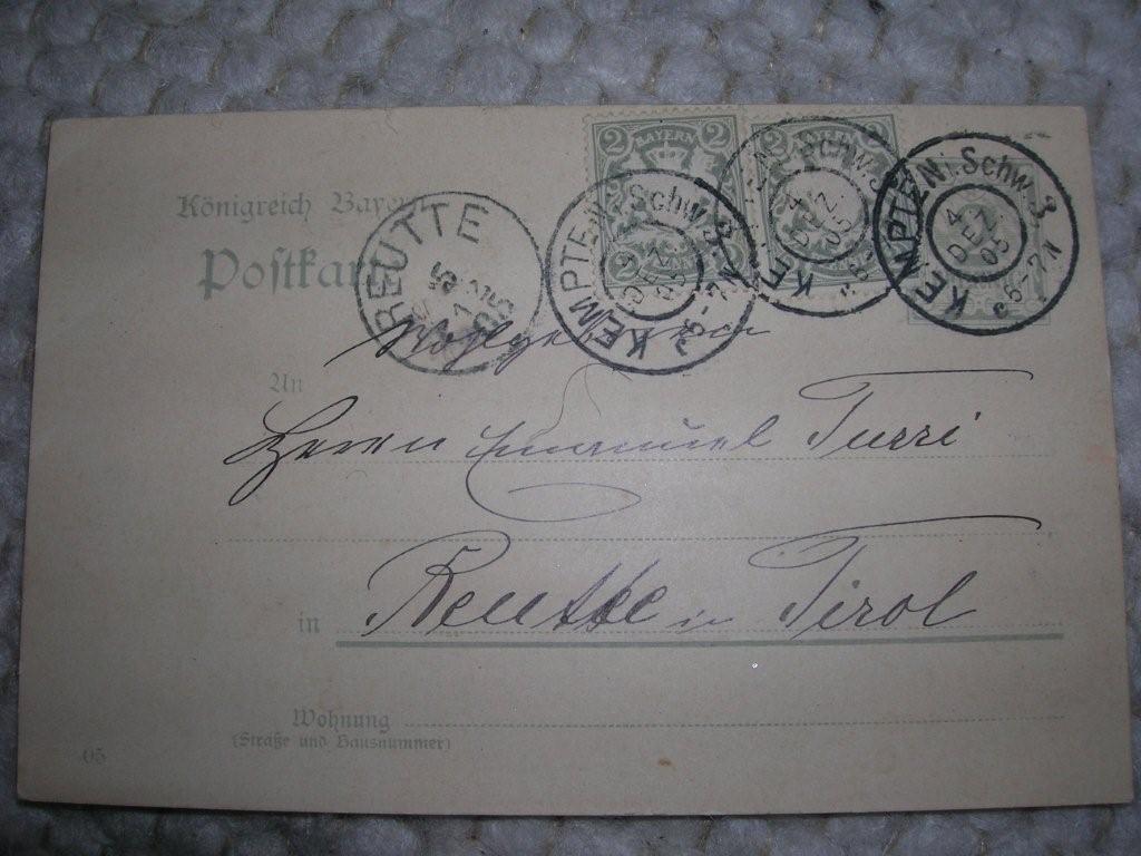 Im uebrigen kommt mir noch die 6pf Gesamtfrankatur seltsam vor. Ich vermute die folgenden Portosaetze, mit der Bitte um Bestaetigung oder Korrektur, damit ich hier auch noch was lerne: Postkarten Auslandsporto war 10 Pf., Inland 5 Pf. Innerorts 2Pf. Wahrscheinlich galt von Bayern nach Oesterreich ermaessigtes (Inlands?) Porto und die Karte mag somit 1 Pf. ueberfrankiert sein.