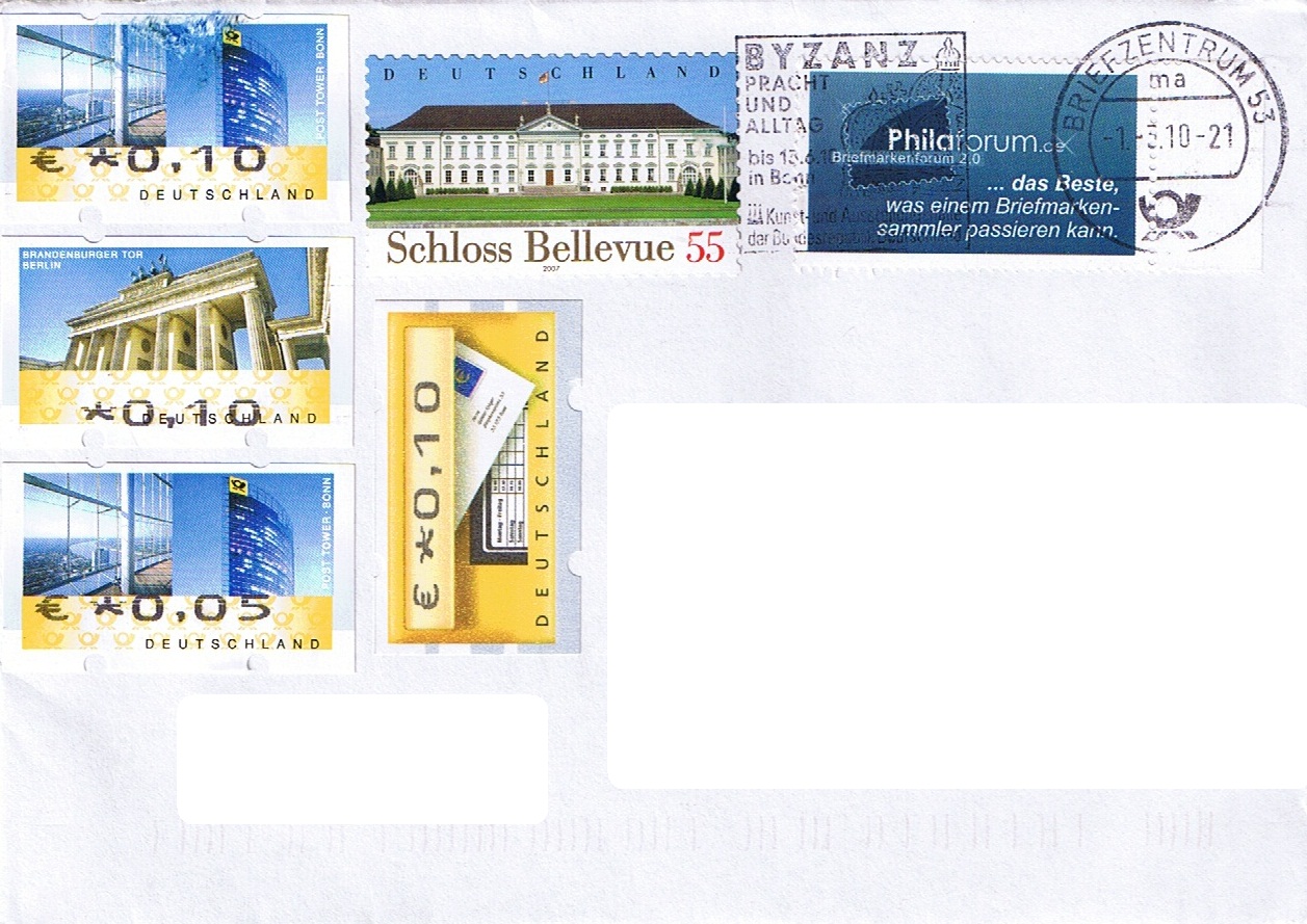 Bezüglich den gestempelten Forumsvignetten besitze ich auch einen sehr sehr schönen Brief. Wenns so weitergeht, wird der wirklich noch, wie wolle sagt eine Rarität und der ist bald fürn Tresor in der Bank. :P Bei dem Brief wurde voll die Forumsvignette abgestempelt, wobei die 4 Automatenmarken unbeachtet blieben. die Marke vom Schloss Bellevue kam nur ganz leicht rechts zu einem Stempel. :D