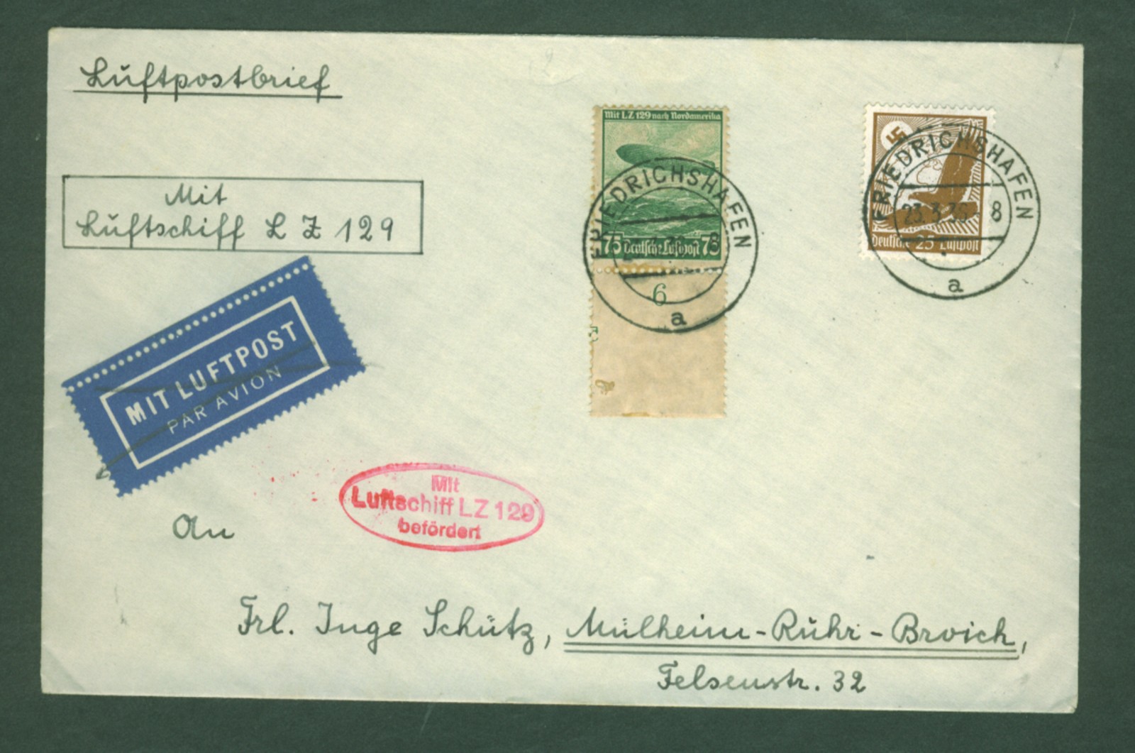 Die Preise für Belege der Katalog-Nrn. 406. A) bis 406. H) gelten für Stücke mit Sondermarken "Mit LZ 129 nach Nordamerika", andere Frankaturen werten 50 % weniger."