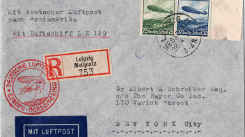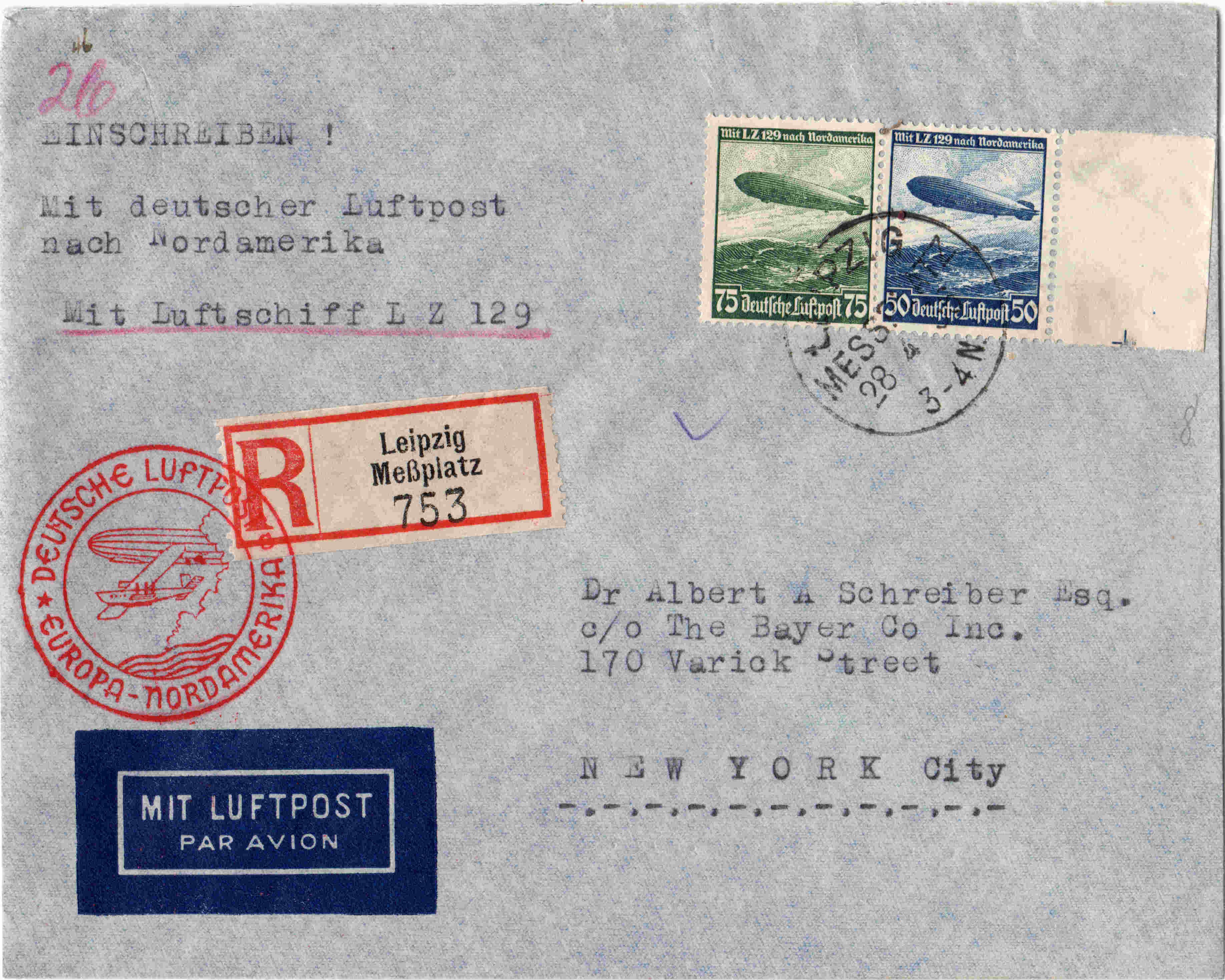 ein Einschreiben aus Leipzig vom 28.04.1936 wurde mit LZ 129 mit der 1.Amerikafahrt vom 6. bis 14.Mai nach New York versandt. Der Brief ist mit den Sondermarken 606/607 frei gemacht worden. Auf dem Brief wurde der Flugbestätigungsstempel aus Frankfurt a.M. (Kennbuchstabe c) abgeschlagen.