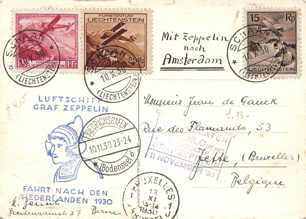 Man sieht den lila Sonderbestätigungsstempel und den Ankunftsstempel Friedrichshafen vom 1.11.28.
