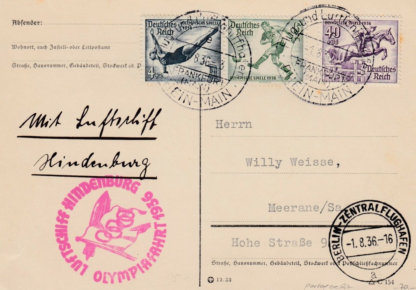 und zusätzlich noch ein Einschreibebrief zur 6. Nordamerikafahrt der "Hindenburg" (5.8. bis 11.8.36) mit Zuleitung von den Olympischen Spielen, ebenfalls mit komplettem Olympiasatz, Sieger 428 D.