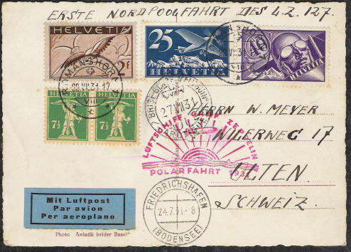 Die auf dem Flugfeld aufgegebene Post für die Fahrt nach Görlitz erreichte das Luftschiff nicht mehr rechtzeitig; sie wurde mit der Bahn nach Friedrichshafen befördert und der Schweizfahrt des LZ127 am 12.10. nach Bern bzw. nach Basel mitgegeben, Ankunftsstempel Bern.