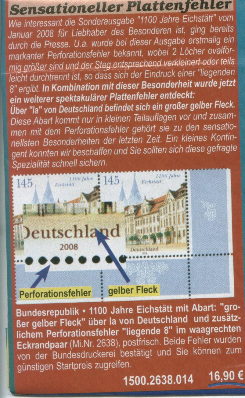 Mir ist da kürzlich eine Preisliste der Firma Waigand ins Haus geflattert, in der eine Abart der Michel-Nummer 2638 (1100 Jahre Eichstätt nassklebend) angeboten wird. Nun hatte ich heute das Glück, auf einer Poststelle noch Restbestände zu finden und habe mir die enstprechenden Stücke gesichert. Beschrieben ist als Plattenfehler ein gelber Fleck über a von Deutschland, den kann ich allerdings hier nicht feststellen. Mir liegt nun ein Stück vor, in dem nur der beschriebene Perforationsfehler ohne den Plattenfehler vorkommt. Hier sind 2 Löcher wie eine liegende 8 ausgestanzt. Schaut selbst: