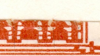 Ich hab mal 2 Marken übereinander gelegt. Alle Achtung sollte es ein Scheerenschnitt sein ist dieser sehr exakt ausgeführt. Was die waagerechte Schnittlinie betrifft könnte es auch sein daß die Markenrolle vor dem Schneidevorgang etwas gewölbt war. Probiert mal ein etwas gewölbtes Stück Papier mit einer Schlagschere zu schneiden, und schaut mal was dabei raus kommt.