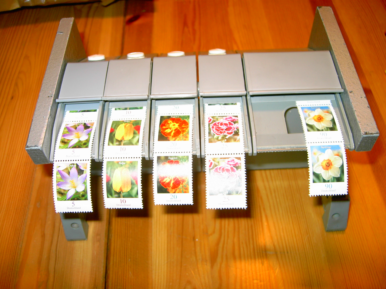 So, ich habe fix noch mal 2 Bilder gemacht, die das Ganze noch etwas anschaulicher machen. Bild 1 ist der ganze Rollenmarkenspender, Bild 2 zeigt dann die Abrisszähne vorne auf der "Spitze".