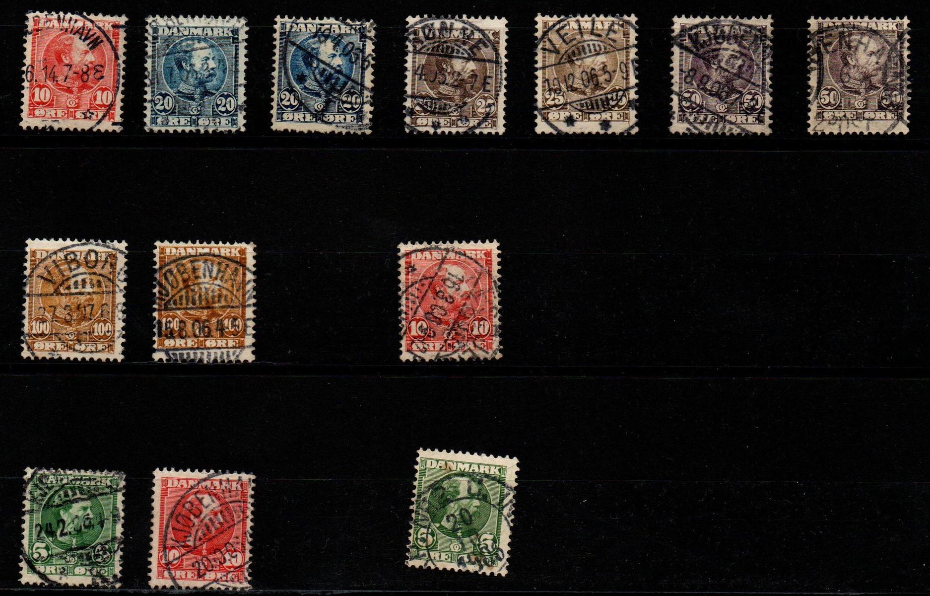 Hier nun die Marken der König Christian IX-Ausgabe aus den Jahren 1904 und 1905. König Christian IX verstarb Ende Januar 1906. Ausgabeanlass war das 40-jährige Thronjubiläum des Königs. Es waren übrigens die ersten Briefmarken mit Königsportrait in Dänemark. (Essays mit Königsportrait aus älterer Zeit gab es einige).