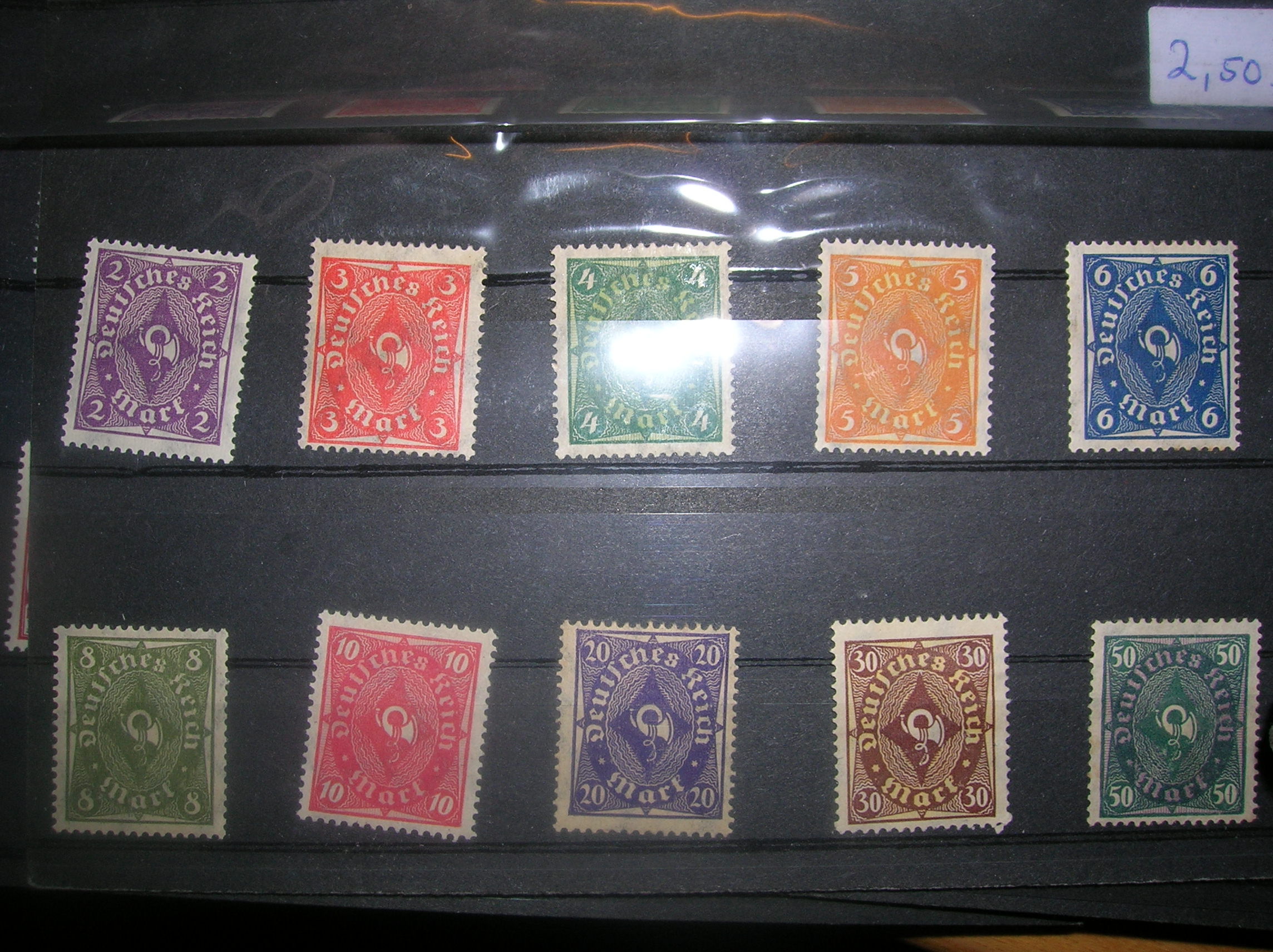 also danke und vielleicht findet jemand ja noch die ein oder andere markeanbei noch 2 fotos ( sind von meinem kauf heute ua....) was wertet der posthornsatz vielleicht kann mir jemand noch die einzelwerte ( siehe marken oben anfangsposting sagen??) und warum hat die 2 pfennigmarke so eine komische farbe ( siehe foto 2)