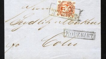 15a6 Pf. orange EF auf Ortsbrief mit Ra3 COELN/ STADT-POST-EXPED./ 11.5.66 nebst Ra1 MODERIRT. Ab Aufgabe von 25 Ortsbriefen ermäßigte sich das Porto je Brief von 1 Sgr. auf 1/2 Sgr. u. nur der oberste Brief erhielt den Moderirt-Stpl.. 25er-Briefe sind viel seltener als 100er-Briefe mit der 4Pf.-Marke, Kab.