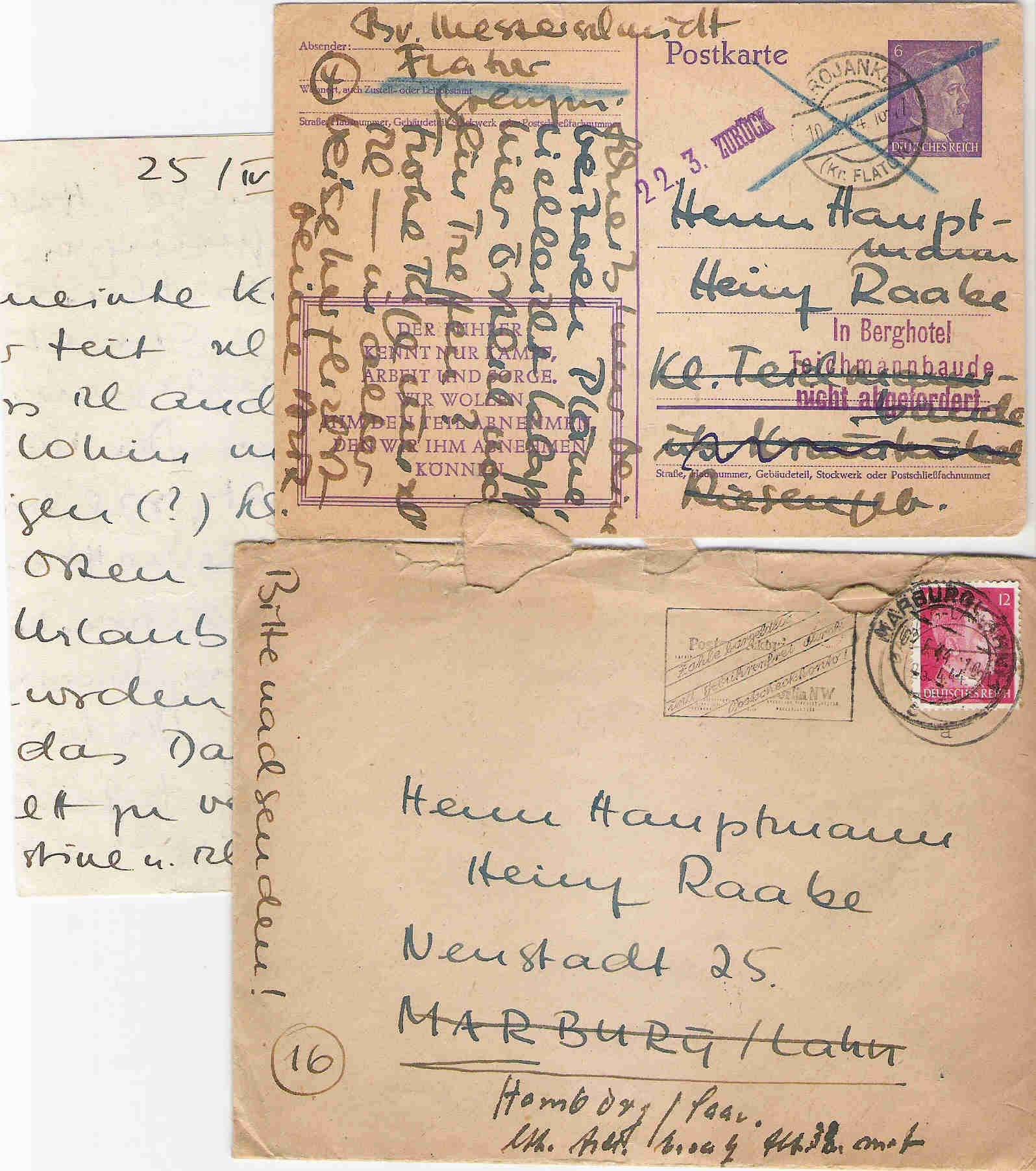 Zusammen mit dem Brief wurde die Karte dann am 25.04 in Danzig-Langfuhr aufgegeben, diesmal an die Heimatadresse(?) des Hauptmanns in Marburg.