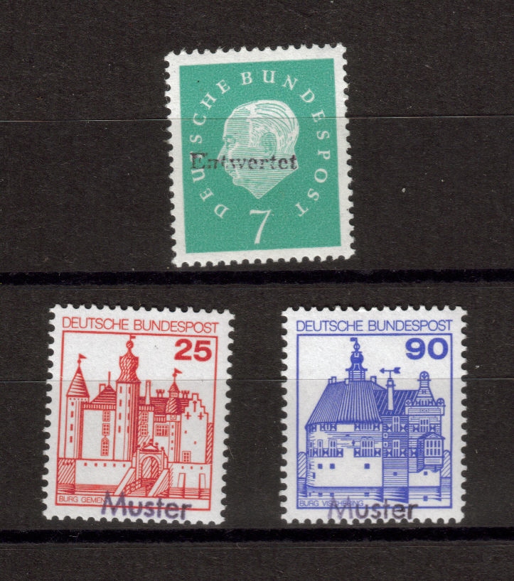 Die 1961 (nicht) erschienene Marke "Brot für die Welt", Michel Nummer X gibt es nur (?) mit Handstempel-Aufdruck Muster. Diese Muster-Exemplare wurden unter anderem an philatelistische Zeitschriften und andere Publikationen mit Briefmarkenteil vor Ausgabe der Marken versandt, um diese entsprechend abzubilden. Da diese Marken kostenlos verschickt wurden, erhielten sie, um Porto-Mißbrauch zu verhindern, den genannten Stempel.