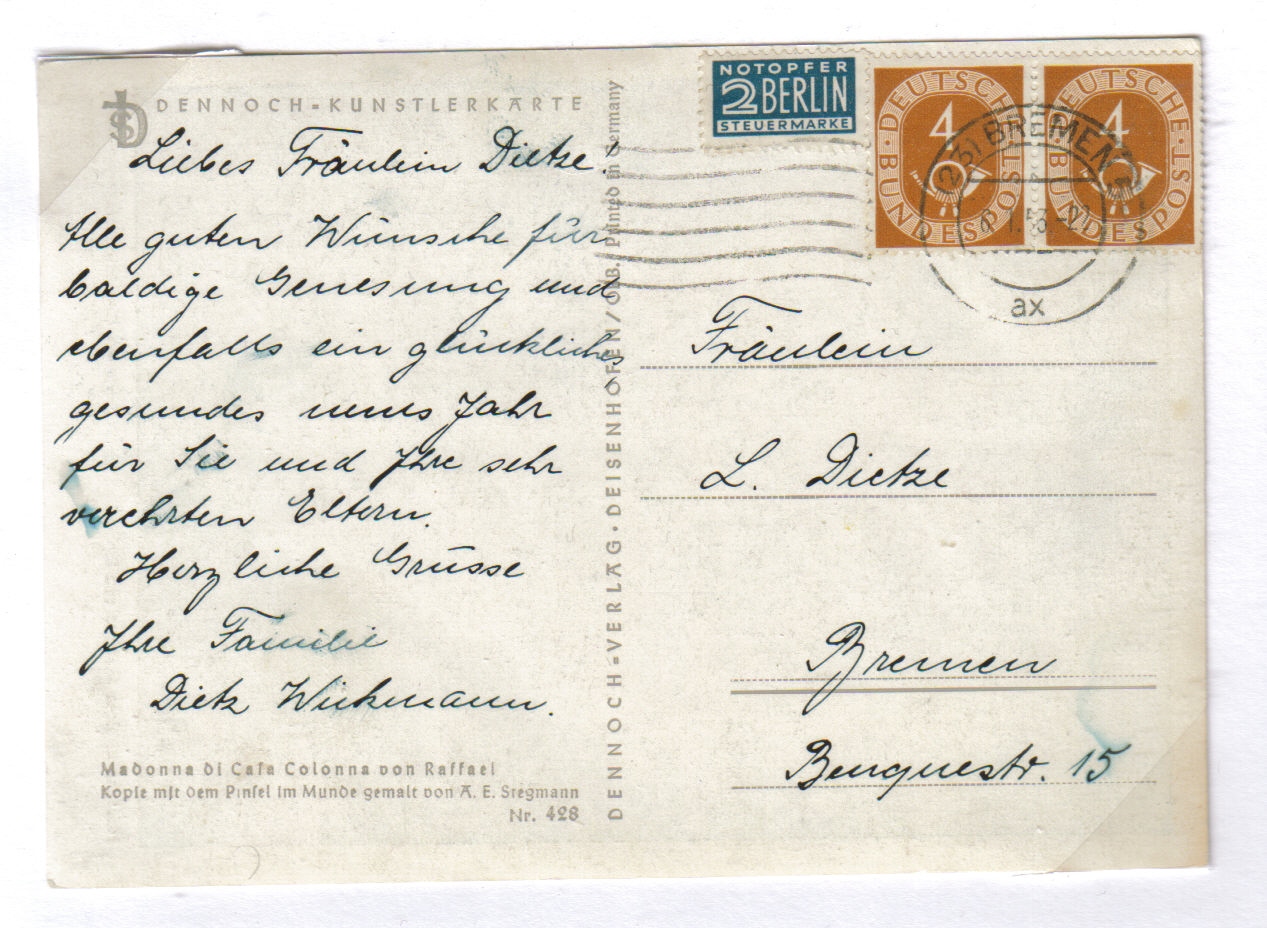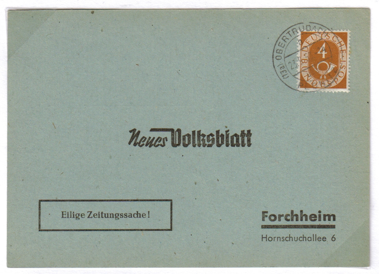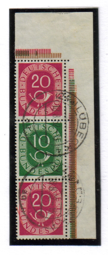 2. Posthornmarken mit Stempel der sogenannten "Übergangsperiode. Diese Periode nennt man den Zeitraum zwischen dem 01.07.1954 (dem Datum der Gebührenerhöhung) und dem 31.12.1954 (letzter Tag der Gültigkeit). Laut Wolfgang Maaßen "Die Posthorserie" wurde einmal das Stempelaufkommen dieser Posthornmarken überprüft. Von jeweils 10000 Marken jedes Wertes wiesen lediglich zwischen 24 (80 Pfg) und 167 (25 Pfg) Marken einen deutlichen Stempel dieser Portoperiode auf. Das sind zwischen 0,25 % - 1,6 %!
