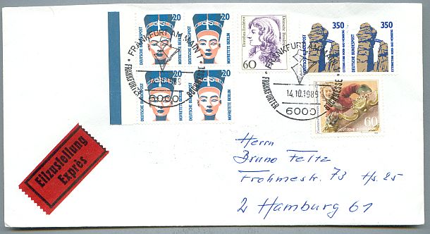 Eil-Luftpostbrief von Münster in Westfalen nach Makati auf die Philippinen. Das Porto für einen Luftpostbrief bis 5 Gramm war 1,50 DM, dazu der Eilzuschlag 3,50 DM, macht genau 5,-- DM !