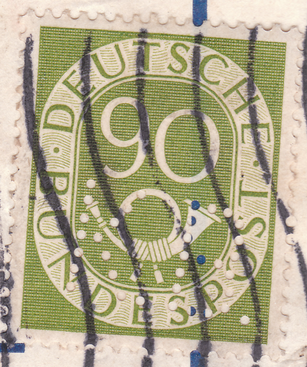 Die Briefmarke wird durch die Lochung nicht entwertet, sondern nur für einen eingeschränkten Gebrauch kenntlich gemacht. Durch amtliche Lochungen von Seite der Behörden wurden Dienstmarken „hergestellt“. In Deutschland wurden z. B. bayerische Dienstmarken bis 1911 durch ein eingestanztes „E“ markiert, australische Dienstmarken erhielten die Lochung „OS“ für „Official Stamp“. Später wurde diese Lochung (OS) durch einen entsprechenden Stempelaufdruck ersetzt. Nicht-amtliche Lochungen dienten meistens als Schutz vor Diebstahl. Firmen mit einem größeren Vorrat an Briefmarken kennzeichneten so ihre Marken. Diese wurden so für den privaten Gebrauch von Angestellten unbrauchbar.Perfins auf Marken der Deutschen Bundespost sind selten und daher freue ich mich über den neu erworbenen Beleg einer Einzelfrankatur des 90-Pfg.-Wertes der Dauerserie Posthorn.
