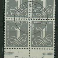 Beginnen möchte ich mit einem linken Eck-4-er-Block der Heuss 4 Pf gestempelt mit Druckerzeichen 6 negativ.