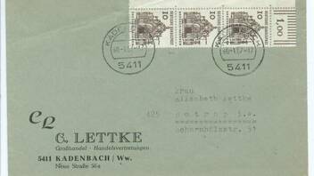 Hier noch ein Brief mit einem senkrechten Eck-3-er-Streifen kleine Bauten 10 Pf mit Druckerzeichen 11. Leider hat er einige Büge, aber das ist in meinen Augen hier zweitrangig. Der ist und bleibt hier in meiner Sammlung ein fester Bestandteil.