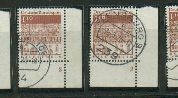 Und zum Abschluss für heute noch einige gestempelte Formnummern aus der Serie Grosse Bauten 110 Pf. Interessant hierbei sind die unterschiedlich breiten Ränder, die es von ganz schmal bis ganz breit gibt.