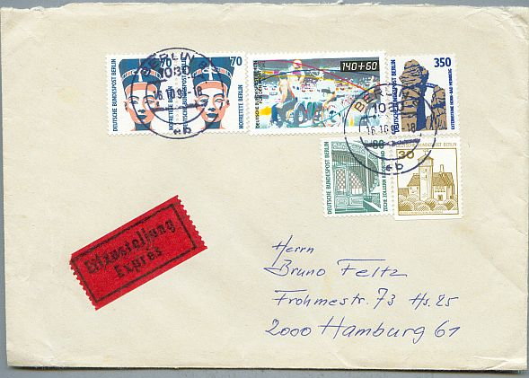 Eil-Luftpostbrief von Münster in Westfalen nach Makati auf die Philippinen. Das Porto für einen Luftpostbrief bis 5 Gramm war 1,50 DM, dazu der Eilzuschlag 3,50 DM, macht genau 5,-- DM !