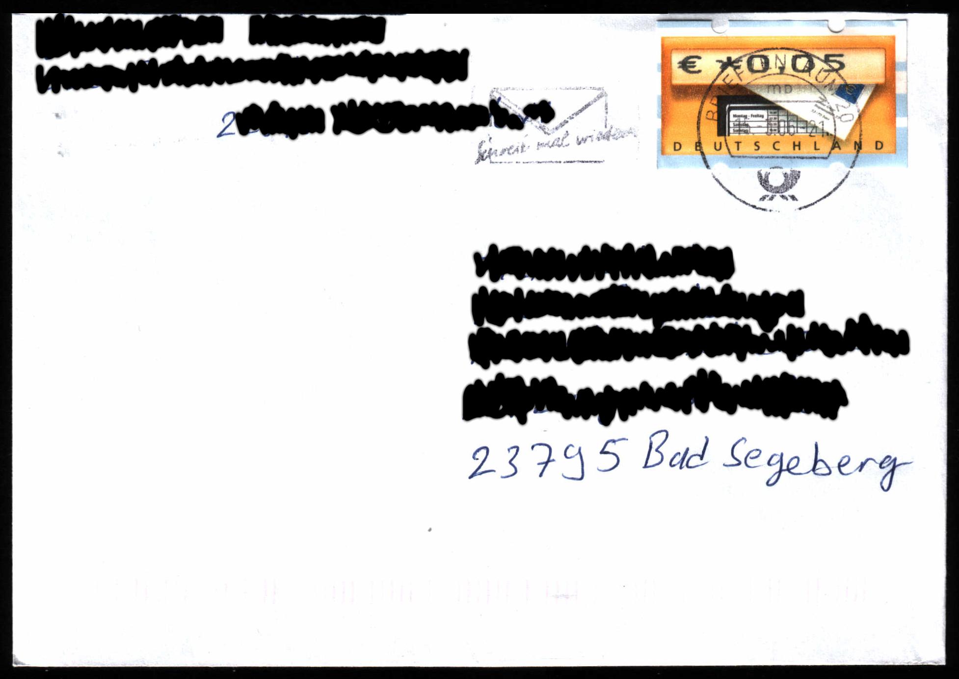 Habe hier etwas Anderes, was deutlich macht, dass es manchen Leuten gelingt, ihre Portokosten auf ein erträgliches Maß zu senken. Die in den Briefzentren merken sowieso nichts mehr und auch der Zusteller hat offenbar nicht bemerkt, dass auf dem Brief nur 5 statt 55 Cent frankiert waren. Bei den Millionen von Briefen, welche da so durchgehen, kann das natürlich schonmal passieren, dass sowas "durchschlüpft".