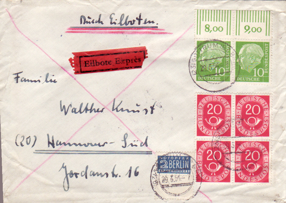 heuss oberrand, posthorn viererblock und notopfermarke mit anhängenden bogenrand