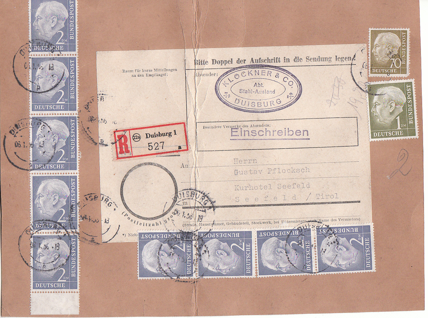 Einschreibebrief von 1958 nach Österreich 1900g mit einer Frankatur von 19,70 DM, die sich wie folgt zusammensetzt