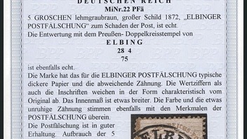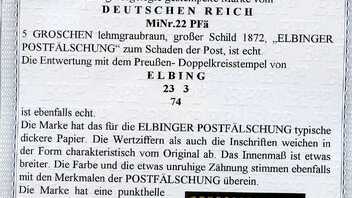 Bei den Attesten werden alle typischen Merkmale der Postfälschung erwähnt..