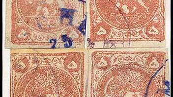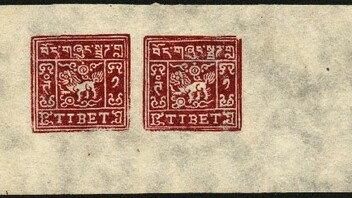 Tibet, ein seltener Musterbogen des 1 Trangka Wertes der Ausgabe 1933 in Farbe dunkel karmin 11D8, Klischees 5 & 12.
