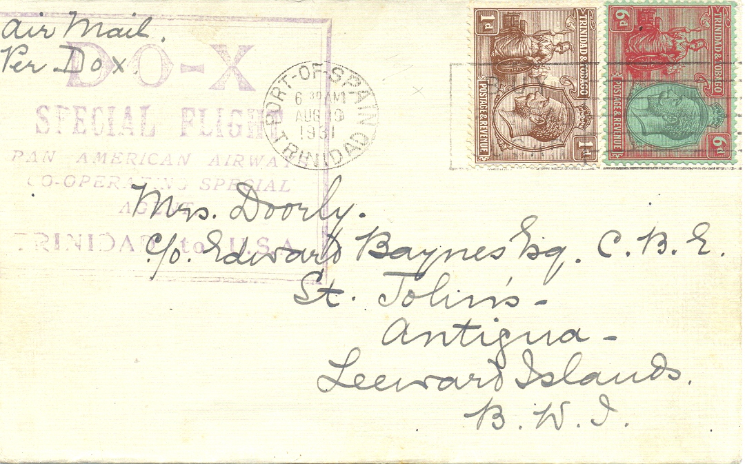 Ganze 96 Poststücke waren auf der Etappe Trinidad-Antigua am 20. August 1931. Dieser Beleg gilt als Bedarfspost. Auf der Rückseite Ankunftsstempel St John's, Antigua vom selben Tag.