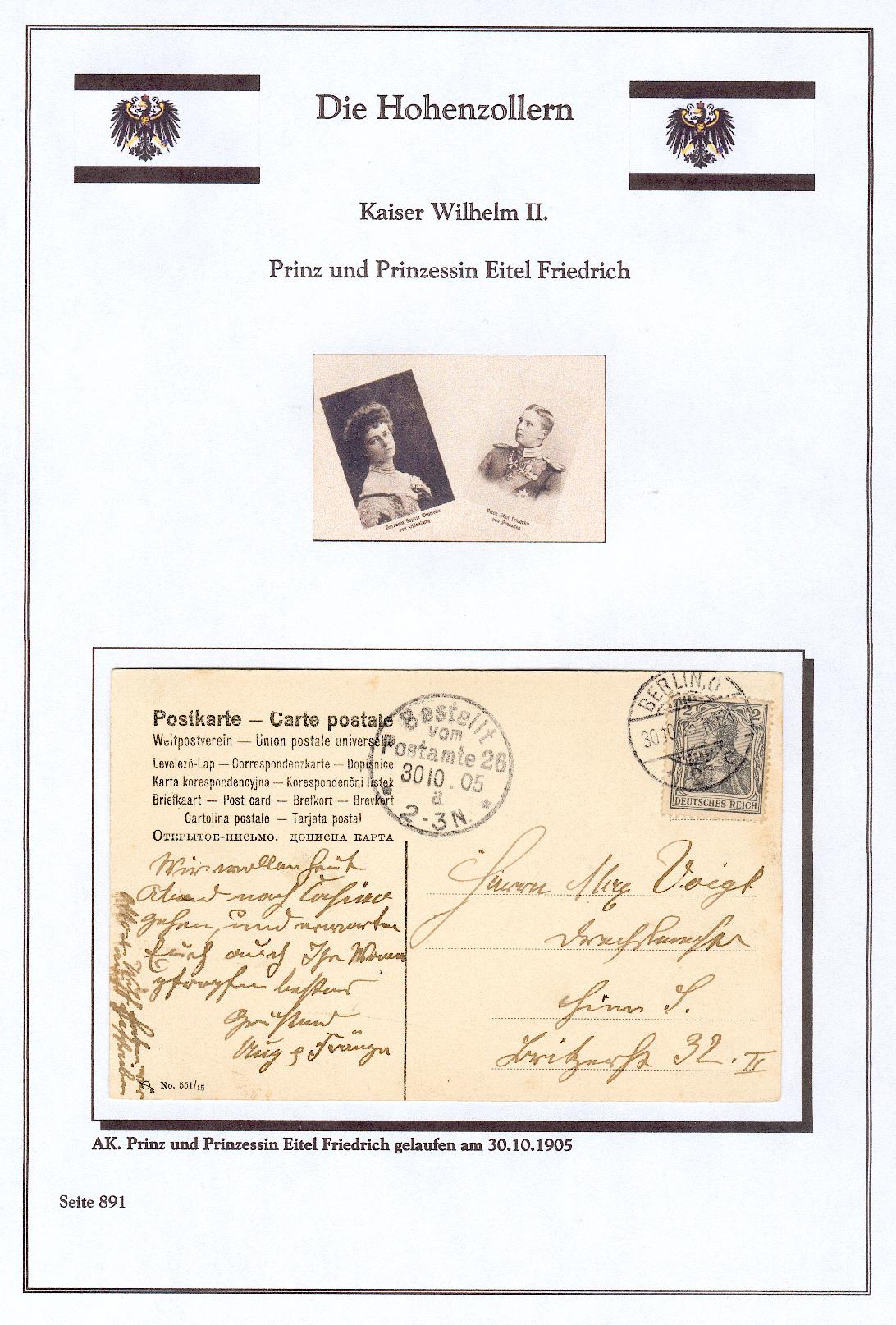 Prinz und Prinzessin Eitel Friedrich auf einer gelaufenen Karte vom 30.10.1905