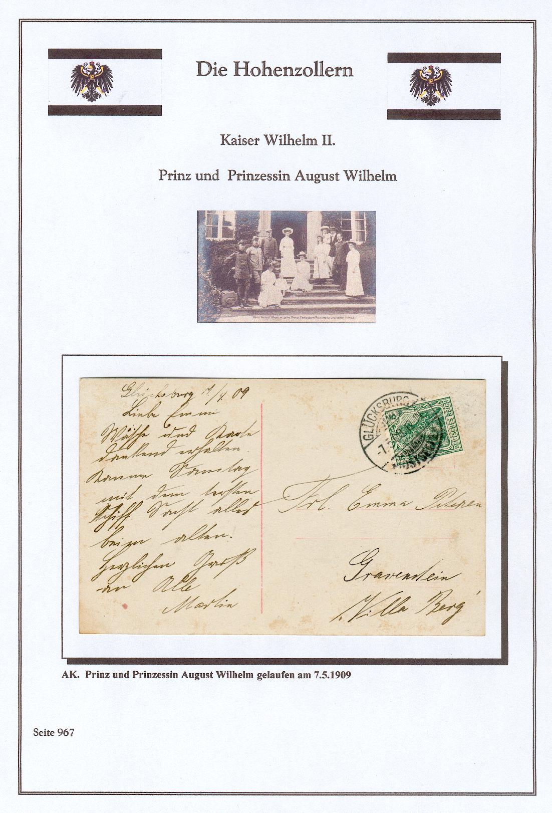 Weiter gehts mit einer gelaufenen Karte vom 7.5.1909. "Prinz August Wilhelm, seine Braut Prinzessin Alexandra und deren Familie".