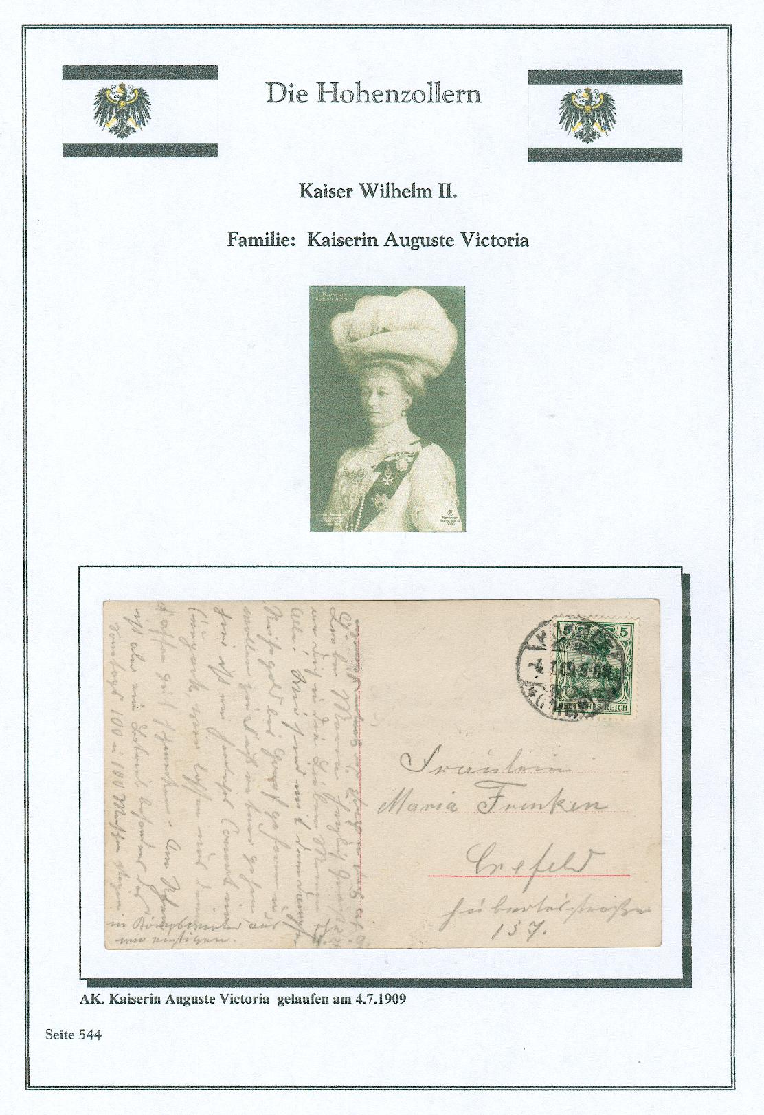 Kaiserin Auguste Victoria auf einer gelaufenen Karte vom 4.7.1909. Fotographiert vom Hofphotograph J. Russel & Sons London.
