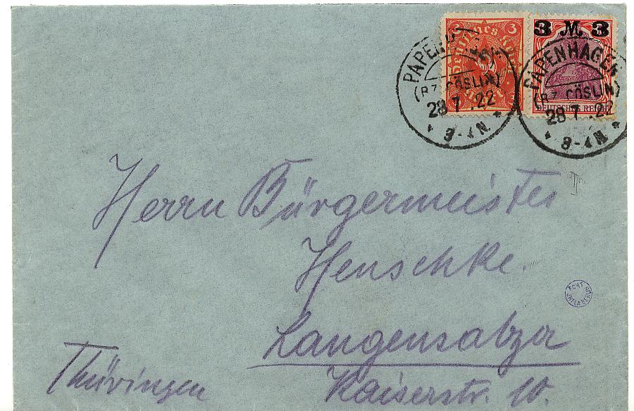 Der Brief ist nicht als Luftpost gelaufen, die Gebühr des Sondertarifes Deutschland-Tschechoslowakei war 1.1.1922 bis 30.6.1922:
