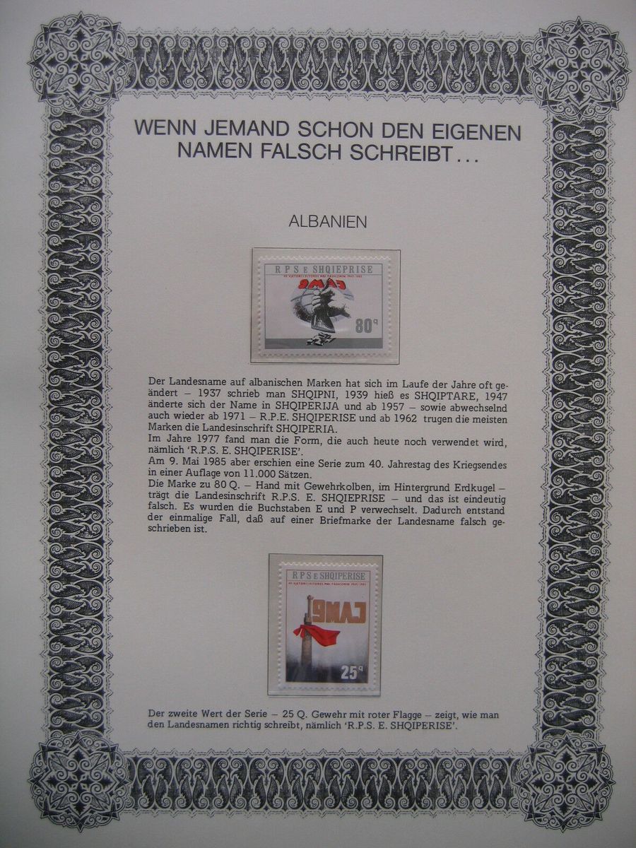1985 hat Albanien 2 Marken "40 Jahre Sieg über den Faschismus" verausgabt. Bei einer der Marken wurde der Landesname mit "SHQIEPRISE" statt "SHQIPERISE" eingedruckt. Laue Michel von 2014 sind 1370 Sätze verkauft worden. Andere Ausgaben Albaniens in diesem Zeitraum haben Auflagen zwischen 10000 und 20000. Ich gehe mal davon aus, dass der Satz zurückgezogen wurde ? Leider steht da nichts dazu im Michel. Steht da heuet mehr drin oder findet sich da woanders was ?