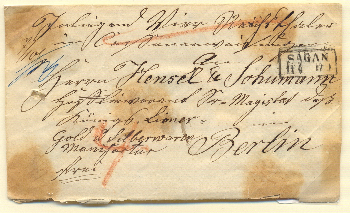 Der Brief aus Sagan nach Berlin ist innerhalb Preussens gelaufen. Da braucht man sehr viel Zeit beim Nachstöbern um herauszufinden, was dieser damals an Gebühr kostete.