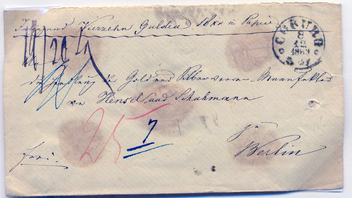 19/20 Loth Briefgewicht, der Absender zahlte 25 Kr. (Preußen rechnete in 7 Sgr. um, was nicht ganz korrekt war, denn 7 Sgr. entsprachen nur 24 1/2 Kr. rheinisch, aber bei der Fahrpost wurde immer nach aufgerundet!).