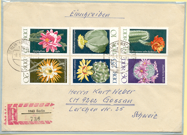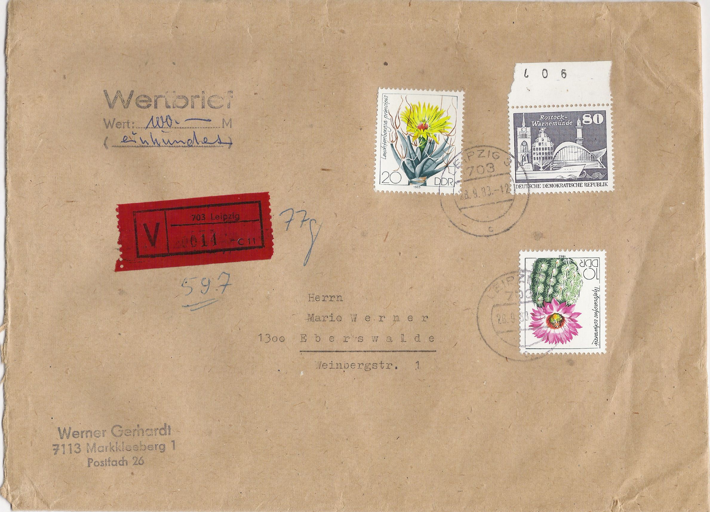 Der dritte Brief von Saguarojo mit 5 x MiNr. 1626 (10 Pf) und 5 x MiNr. 1627 (15 Pf) = verklebte Nominale 1,25 M ist als Inlandsbrief 20 Pf (bis 250 g 40 Pf / bis 500 g 60 Pf) + Einschreiben 50 Pf überfrankiert, denn es ergibt sich - ein höheres Gewicht unterstellt - kein passender Tarif.