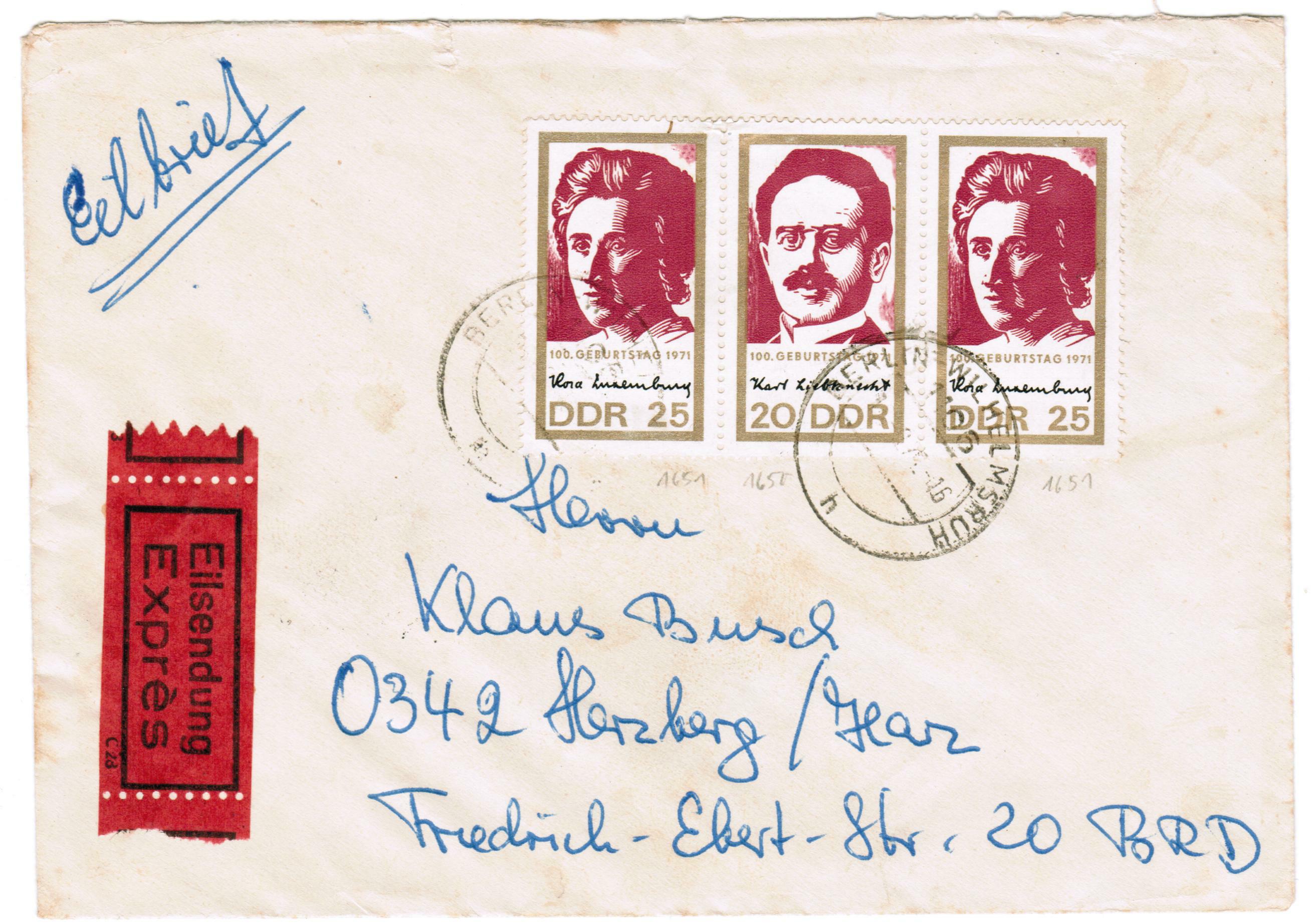 ein mit 5 Pf überfrankierter Satzbrief mit Minr. 635-639 (20 Pf Fernbrief bis 100 g und 50 Pf Einschreiben). Allein der Plattenfehler 637 II (Punkt im C von DEMOKRATISCHE) ist hier das Salz in der Suppe. Die 635 hat im P von Republik eine Unregelmäßigkeit.