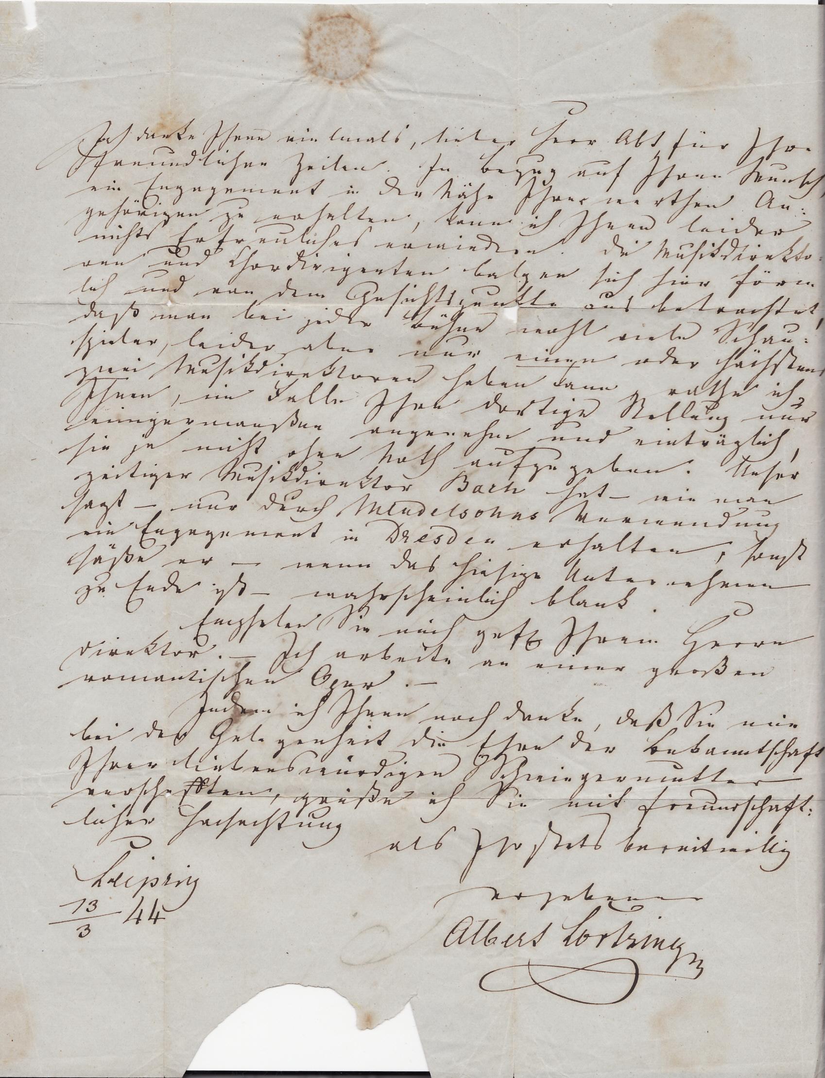 natürlich ist der Inhalt wichtig. Vor allem wenn man auch mal Glück hat und einen Beleg bekommt der von einem mehr als nur bekannten Autographen stammt. Im Anhang habe ich diesbezüglich mein schönsten Beleg, ein Brief vom 20.04.1844 aus Leipzig nach Zürich an den dortigen Musikdirektor Abt, gescannt. Der Absender ist Albert Lortzing (Komponist von Zar und Zimmermann). Er war von 1845 bis 1847 sogar Kapellmeister am Leipziger Stadttheater. Bereits 1833 war Lortzing in Leipzig musikalisch aktiv.