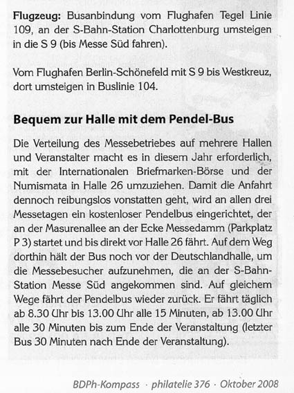 besteht die Gelegenheit, sich ohne allzu großen Anreiseaufwand während der „Internationalen Briefmarkenbörse Berlin 2008“ in der Messehalle 26 am Funkturm (siehe Lageplan in der Anlage,