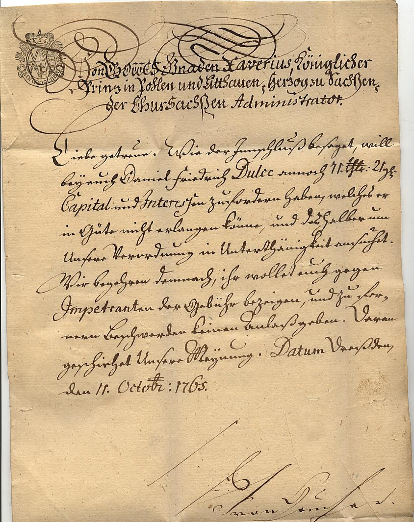 Liebe getreue. Wie der Innschluß besaget, will bei euch Daniel Friedrich Dulce annoch 71 ... 2 ...Capital und Interessen zu fordern haben, welches er in Güte nicht erlangen könne, und deshalber um unsere Verordnung in Unterthänigkeit ersuchet. Wir begehren demnach, ihr wollet euch gegen Impetranten ... Gebühr bezeigen und zu ... Beschwerden keinen Anlaß geben. Darangeschicket unserer Meinung. Datum ... den 11. October 1765.