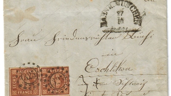 hier ein Brief von München nach Eschlikon im Kanton Thurgau/Schweiz, vom 27. Okt. 1857, frankiert mit einem Paar der MiNr 4II2, aus dem III. bayer. Rayon (über 20 Meilen zum Taxpunkt Lindau/Konstanz) in den I. schweiz. Rayon (bis 10 Meilen). Laufweg über Romanshorn und Winterthur.