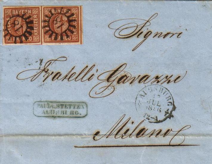 Ich zeige mal einen Brief aus Augsburg mit einem hübschen Paar der 6 Kr. Platte 1 nach Mailand, der zwar ein vereinspostalischer Brief war, aber über die Schweiz lief. Hierfür waren 3 Kr. zu bezahlen, von denen Bayern am Ende des Quartals die Hälfte von Österreich (Mailand) wieder bekam. Die restlichen 9 Kr. gingen für Briefe über 20 Meilen bis 1 Loth drauf.