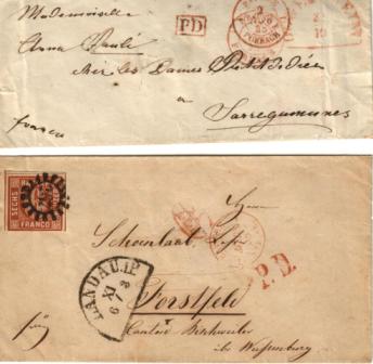 Am 18.7.1859 lief der Absender aus dem französischen Lauterbourg über die Grenze nach Langenkandel (heute Kandel in der Südpfalz) und gab dort einen Brief an das Bankhaus Bethmann in Frankfurt am Main auf.