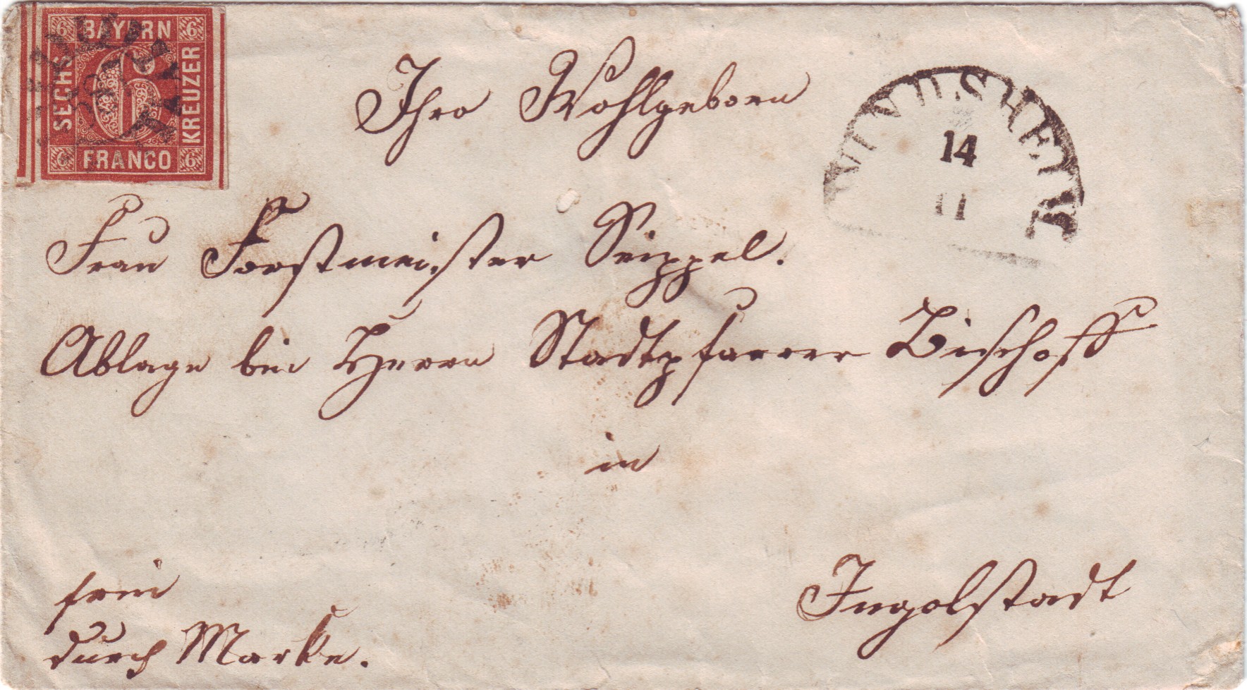 Ich habe hier ein Mi 4 II Platte 1 auf den Brief der von Vilsbiburg nach Laufen gelaufen ist. Der Brief hatte 2. Gewichtsstufe und es hat 6 Kreuzer gekostet (für Briefe bis 12 Meilen). Briefmarke trägt ein geschlossene Mühlradstempel 361 von erste Verteilung.