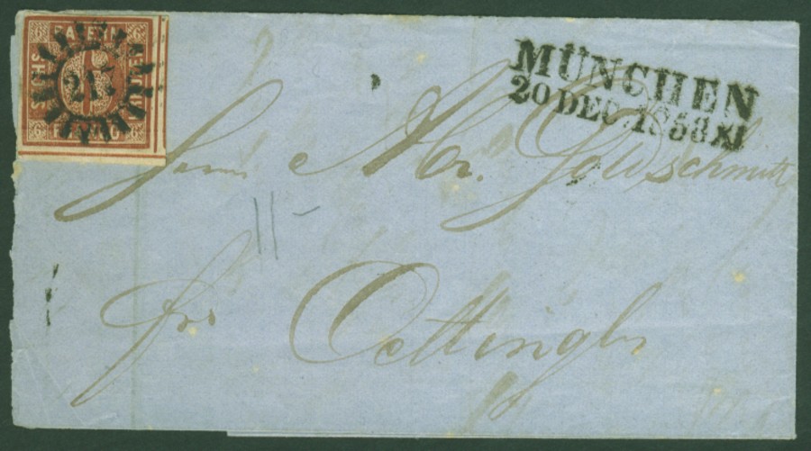 Der Brief lief am 20.12.1858 von München nach Oettingen, ankunftsgestempelt am 21.12.1858.